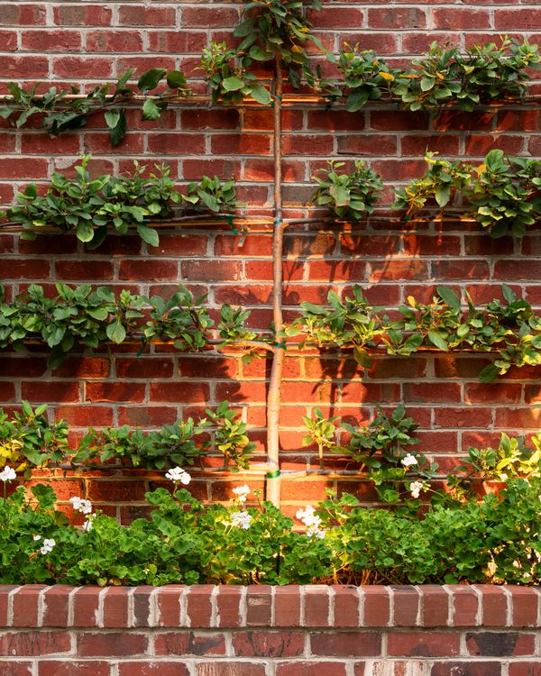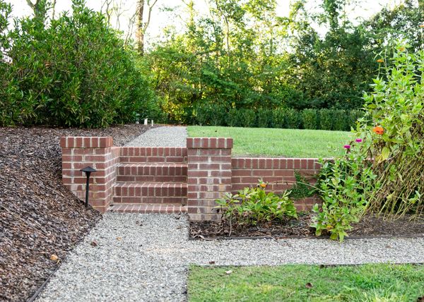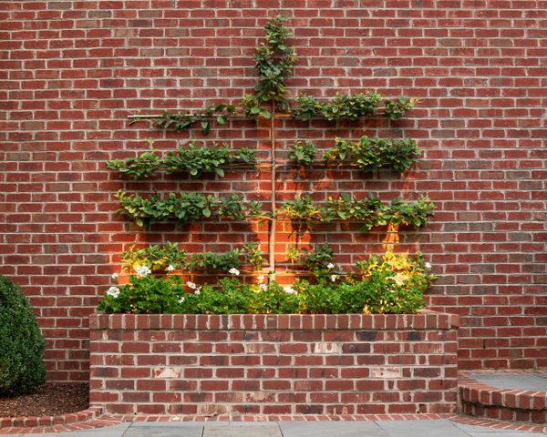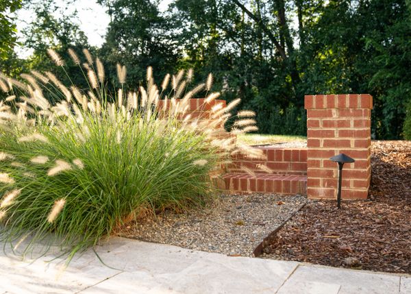 A new home-owner relocated to Charlotte, NC with a stunning church steeple from California in need of a prominent resting spot visible from a central window. Placed over a removed fountain, it is simply skirted with Mondo Grass and brick pavers. Removing a grill island allowed space for a raised planter featuring an espalier apple.