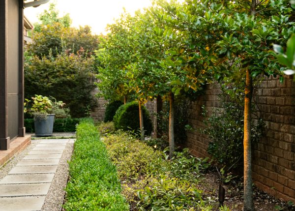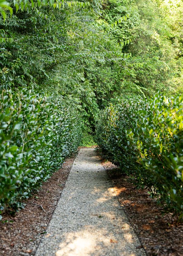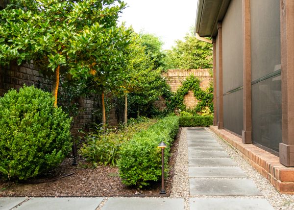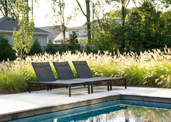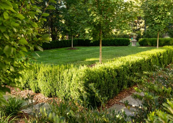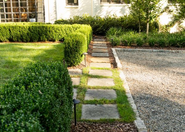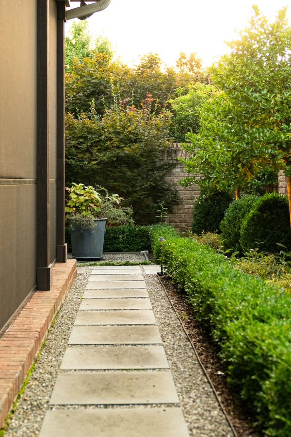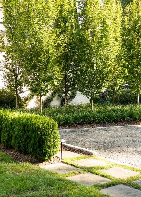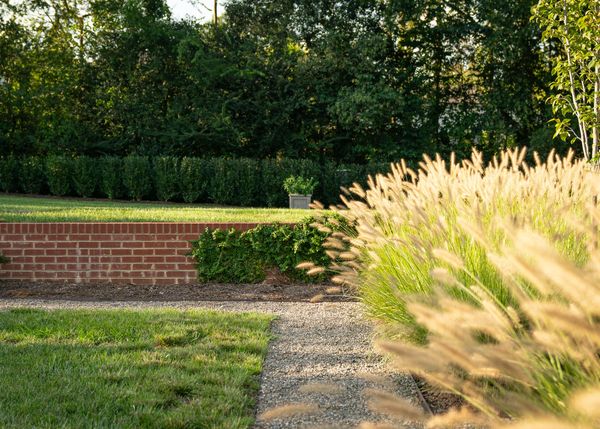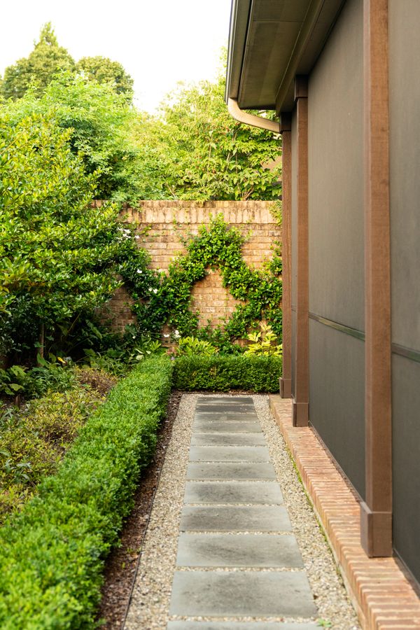 The elimination of an outdated front driveway allowed for a grassy courtyard featuring the state tree of the owner’s home state, framed in a simple boxwood hedge. The front-of-house parking area, previously a visual nuisance from the dining room window, has been discreetly repositioned to the side. The backyard is now enhanced with a simple pool palette featuring warm-season grasses and expansive lawn for family play. This inviting space is framed with a pea gravel path and a Camellia hedge.