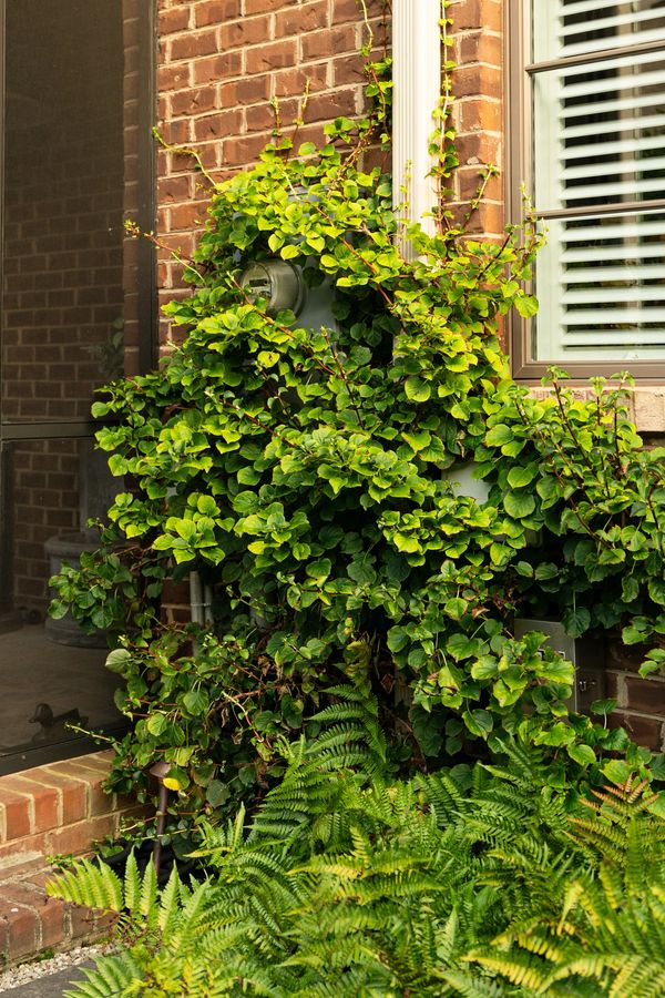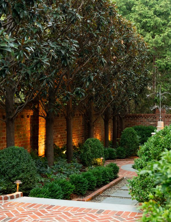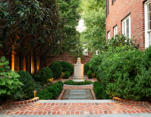 Downsizing to a new townhome, the owner knew a builder-grade landscape needed an overhaul. Bluestone pavers were added for proper flow from the screened porch, to both gates. Framed in a low boxwood hedge, up-lit Holly trees offer depth to a shallow space, which provide screening to large brick walls and neighboring rooftops. Espalier Japanese Maple, Styrax and Confederate Jasmine add texture, fall color, and form to the garden. Climbing Hydrangea covers utility boxes that are visible from outdoor seating.